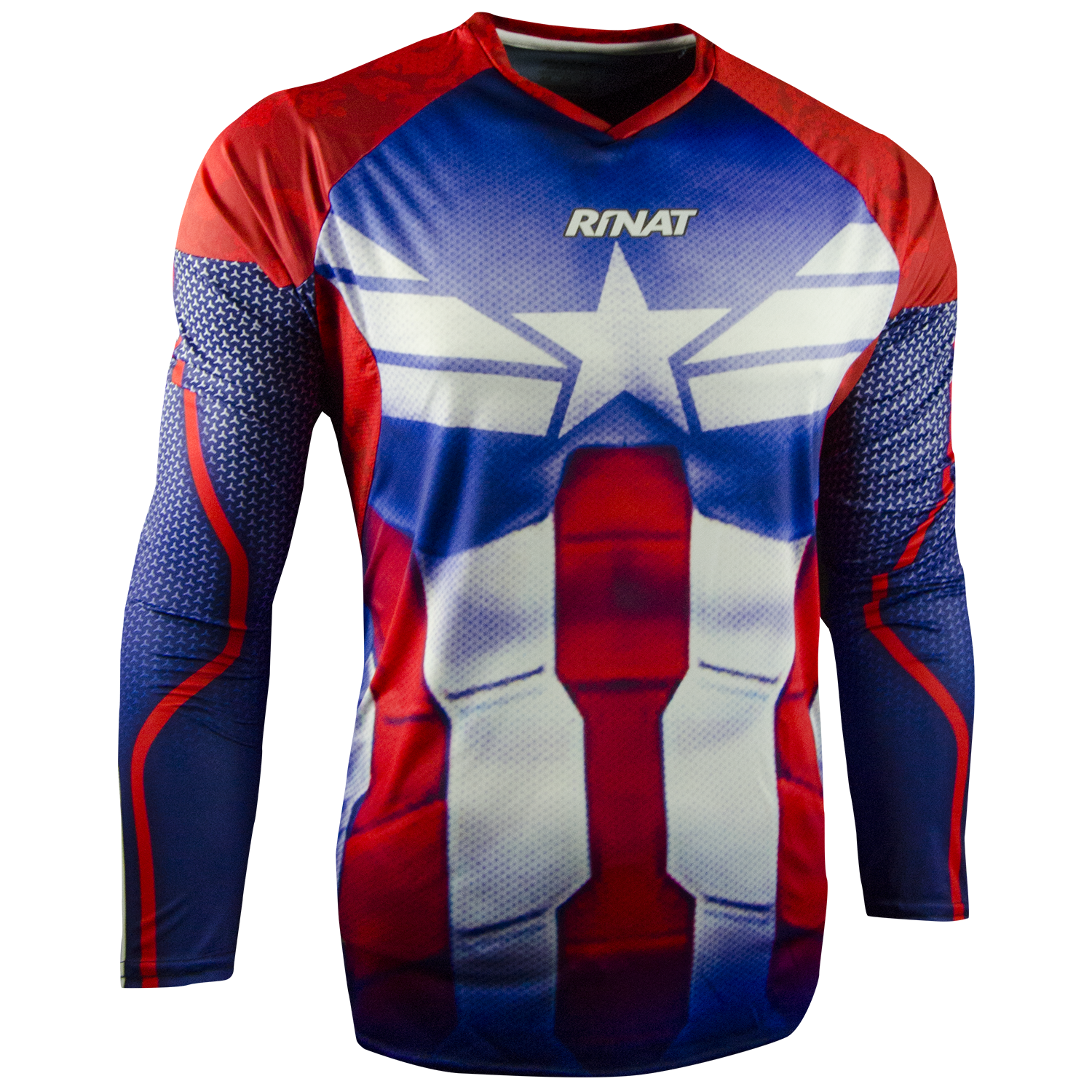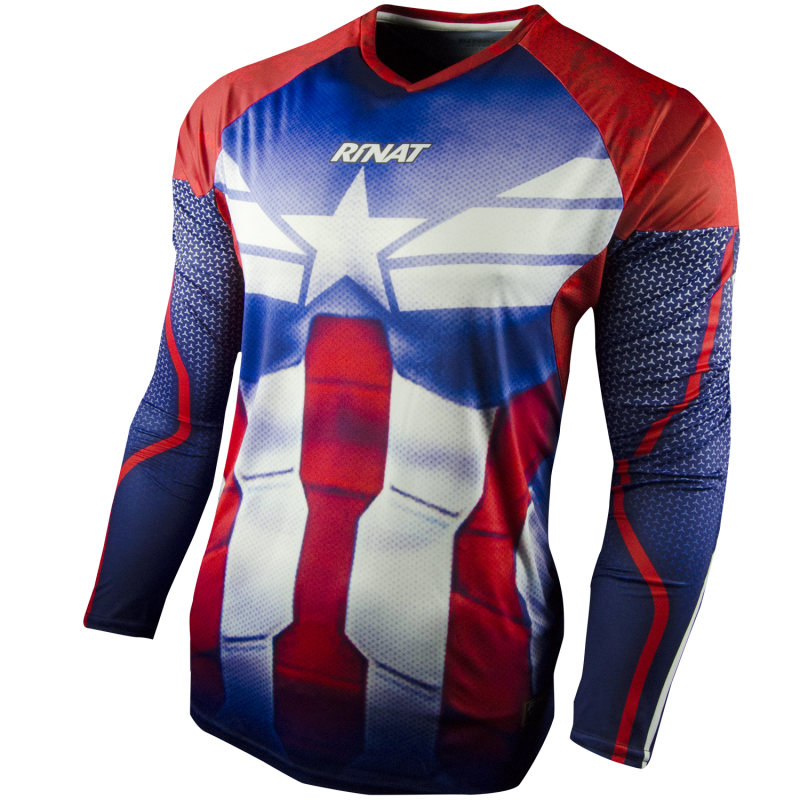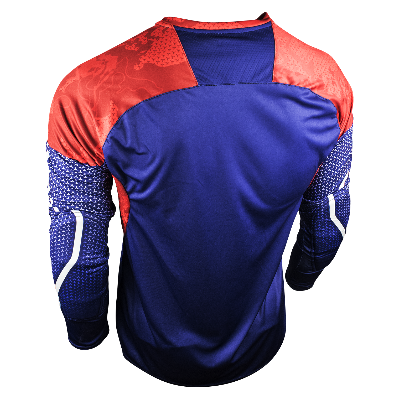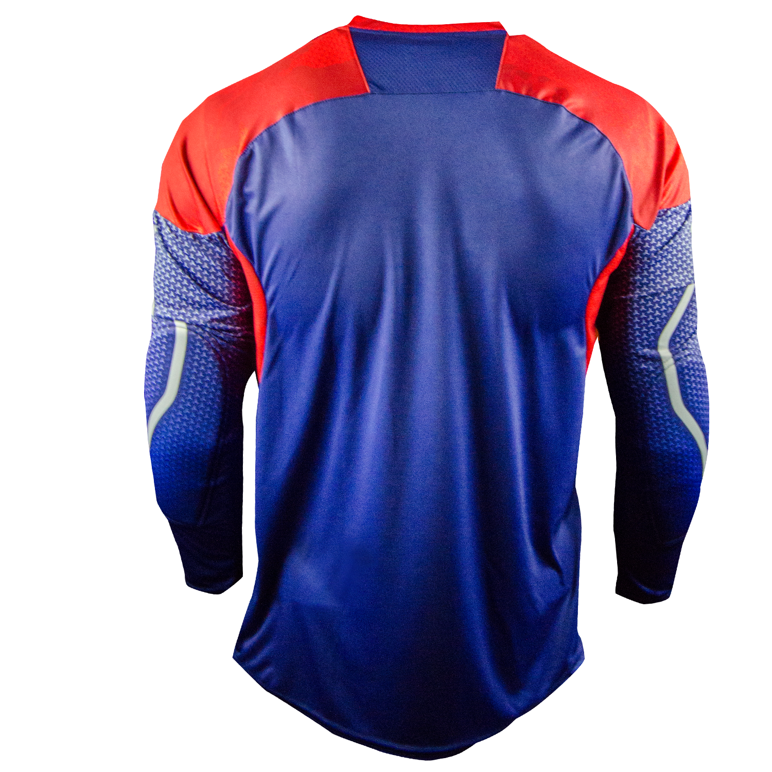 Cushioning on elbows and forearms. Sublimated front, back and sleeves..