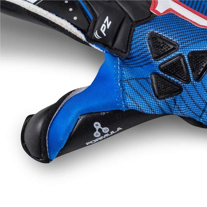 Dorso: Aplicación con volumen que cuenta con paneles de absorción de impactos, está ubicado y protege la zona de los nudillos. Injertos de goma en dedos y base del pulgar, todo montado sobre neopreno en la zona superior y BREATHEX a partir de la zona media y se extiende hasta por debajo de la muñeca.